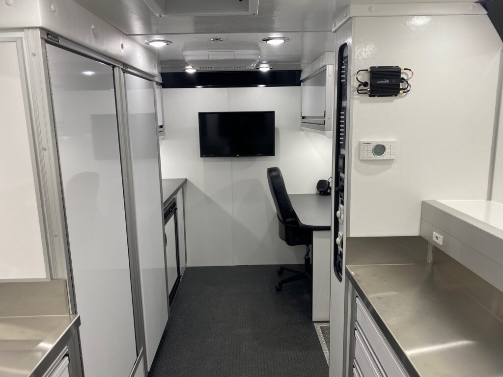 Rolling headquarters with integrated communications, workstations, and power management for on-scene command and control.